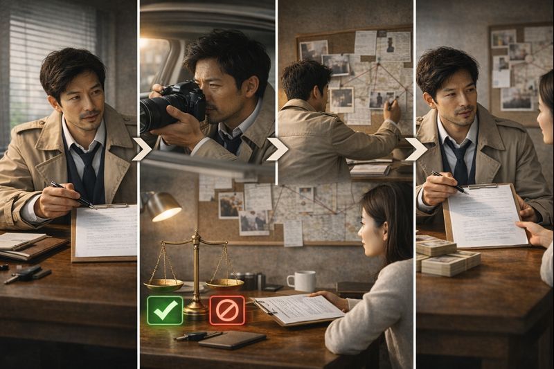 ※本記事は一般的な調査の流れを解説したものであり、個別のケースや探偵社の規定により細部が異なる場合があります。具体的な手続きやアフターフォローの範囲については、必ず事前に確認を行ってください。